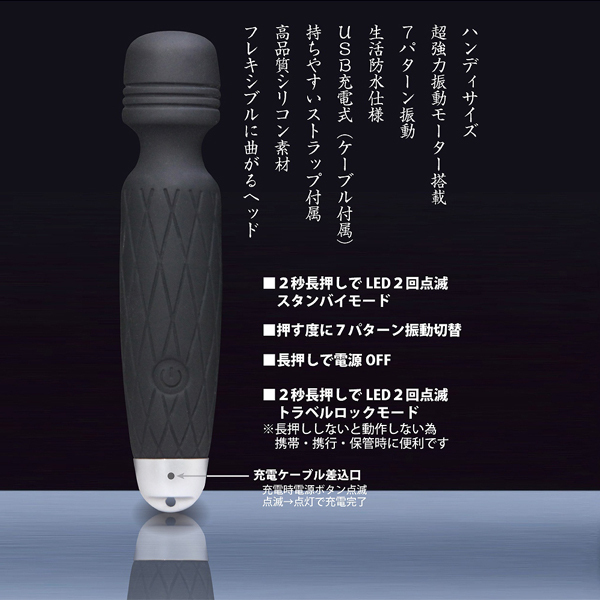 小さいのに超激震!手のひらサイズのコンパクトなUSB充電式電マ(黒)。肌に優しい高品質シリコン素材を採用!柔軟に曲がるフレキシブルヘッドで欲しい部分をピンポイントに刺激する♪幅3cmほどの先端部には強力振動モーターを搭載、振動パターンは7種類からお選びいただけます。生活防水仕様、ケーブル付属