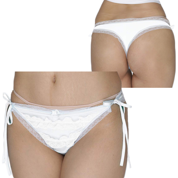 艶やかな光沢のある白生地に同色のフリルとレースを飾り甘く仕上げた日本製Tバック(白)。2段に施されたフリルレースが甘くて可愛い!サイドは紐を結んで留めるタイプなので着脱楽々です♪