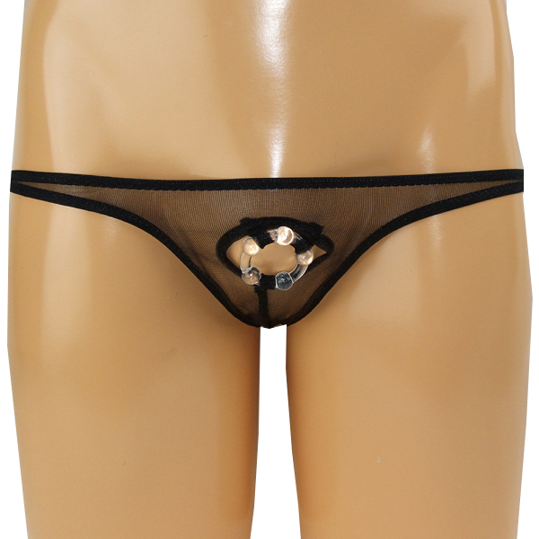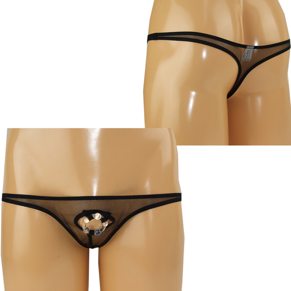 逞しいボディをアピールするならセクシーな小悪魔Tバックで決まり!極薄生地のフロント部分を丸く切り抜き、締め付け刺激するイボ付きリングを取り付けたメンズ用の日本製オープンランジェリー。透ける生地から見える健康的な肌に思わずドキッ!魅惑のボディで小悪魔に誘惑するメンズ用穴あきTバックです。