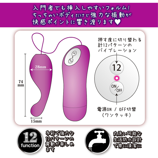 Gスポ刺激で連続快感!中イキ好きにはたまらないシリコンローター。ポコッと飛び出た先端が絶妙な角度でGスポを狙い撃ち!コンパクトボディから繰り出される12パターンもの強力振動が最高の絶頂へと誘います。初心者さんも簡単なシンプル操作!肌に優しい柔らかなシリコン素材を採用。生活防水、電池式(単4電池×2)