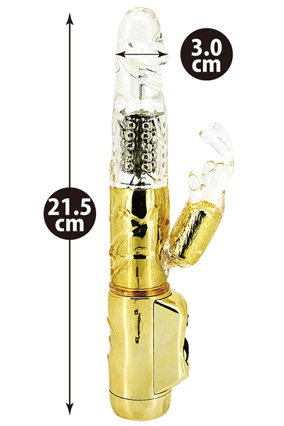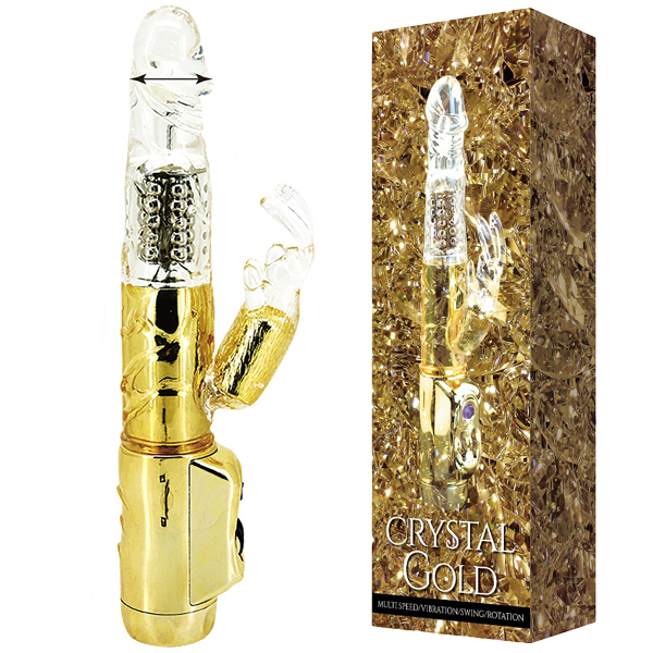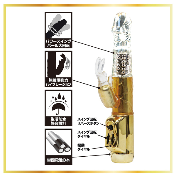 高級感のある見た目と強力スウィング&振動に圧倒される!クリスタル×ゴールドの子機付きバイブ。肌に優しい柔らか質感のエラストマー素材を採用♪豪華なボディから生み出されるのは、強力スウィングとパールの大回転に加えて子機バイブの無段階の強力振動。白目剥くほどの快感に絶叫悶絶!生活防水&静音設計、単4電池×3本使用