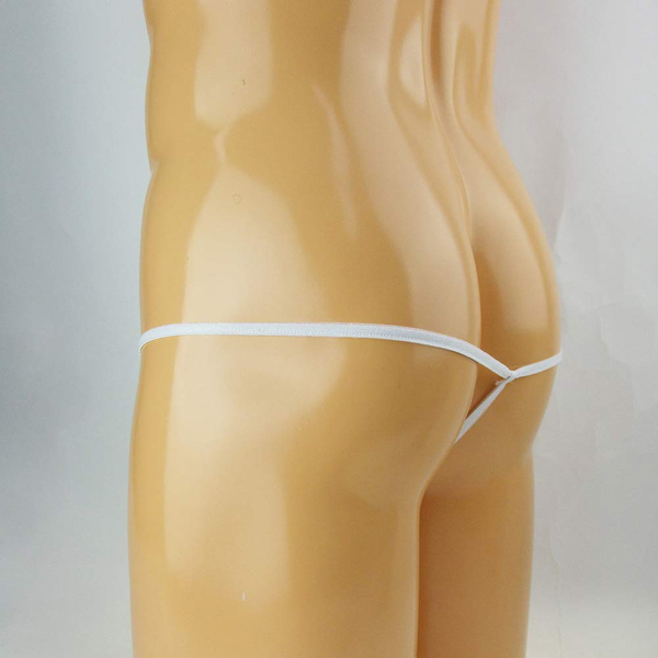 スケスケ感が大胆過激な日本製のメンズ用セクシーTバック(白)。肌が透けて見える通気性抜群な極薄生地と腰の細紐を丸型のゴールドリングでジョイント!夏などの暑く蒸れやすい時期にうってつけの一枚。