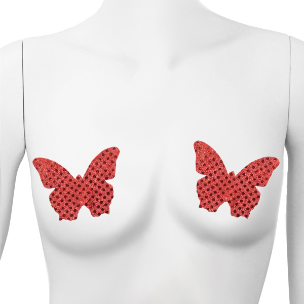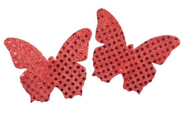 ラメがキラキラと光る赤い蝶で胸を飾るお洒落なニップレス(赤)。シール裏面の中央部分(乳首周辺)には肌保護のため粘着しない素材を使用!ヌードよりもセクシーに魅せるバタフライニップレス。2枚で1セット※もし肌に合わないと感じた場合は直ぐにご使用を中止してください。