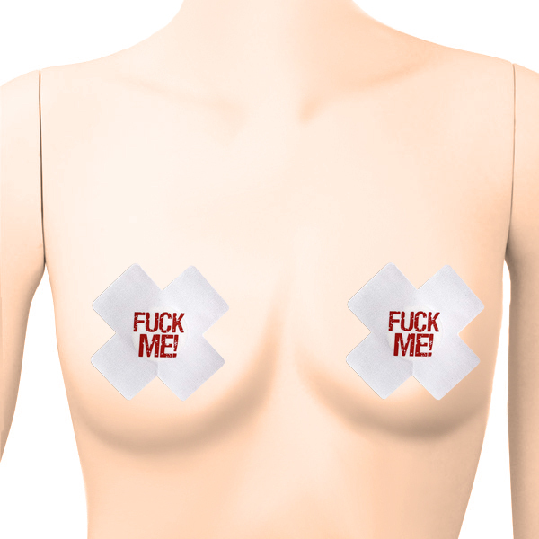 こんな風に主張されたらたまらない!「FUCK ME!」と大胆にアピールする2枚1セットのニップレス(白)。バッテン型のニップルシールが貴方の秘めた想いを叫ぶ!乳首に触れる中央部分には肌保護として粘着しない素材を使用しています。擦れ・透け防止にも◎