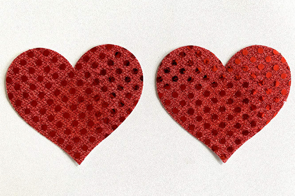 キラキラ煌めくラメで貴方の想いを伝えるハート型のニップレス(赤)。シンプルなデザインで使いやすい!擦れ、透け防止に是非どうぞ♪バストトップ裏面中央部分には粘着しない素材を使用。2枚1セット