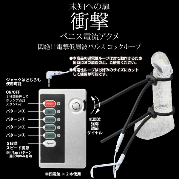 低周波パルスで悶絶電流責め!ペニスに電気を流して刺激するコックループ(電池式)。ビクンビクンと脈打つような刺激がクセになる!4パターンのパルス×5段階スピードが味わえるエレクトリックグッズ。低周波責めでまだ見ぬ世界の扉を開く!ループはペアで動作しますので、必ず2つ同時装着でお楽しみ下さい。単4電池を2本使用