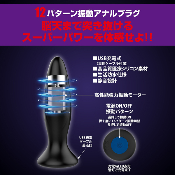 前立腺から頭の先まで駆け抜ける衝撃!高性能モーターを内蔵したUSB充電式の電動アナルプラグ。高品質な医療用の滑らかなシリコン素材を採用でお尻にスルッと挿入しやすい♪肛門に装着後は1つのボタンを押すだけで、電源のオンオフから12種類もの多彩な振動パターンを操作可能!脳天を貫くようななパワフル刺激で快感体験♪生活防水&静音設計
