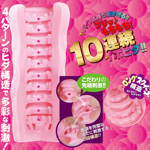 プリもち質感のイボヒダ10連続!4種類のヒダ構造で多彩な刺激を堪能できる非貫通型アンサンブル オナホ(ローション付)。先端刺激にこだわった構造で亀頭を徹底的に刺激♪全長18cmのロングボディが根元から先まで締め付け咥え込み離さない!日本製