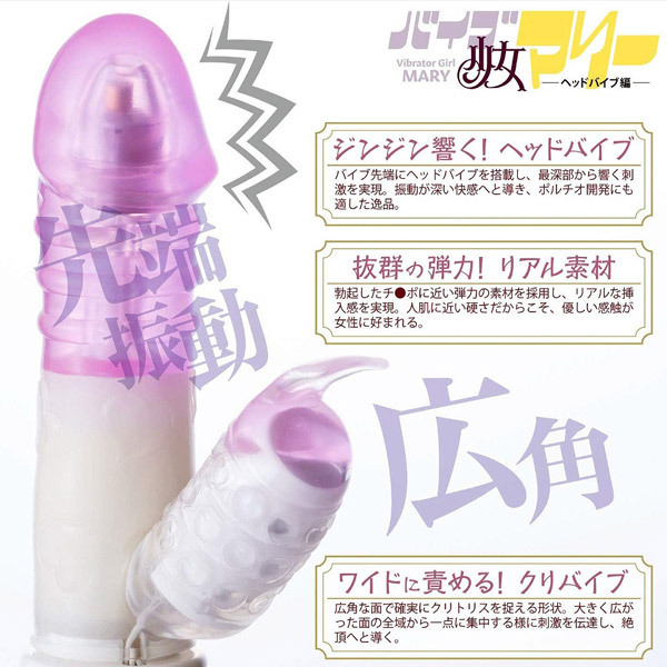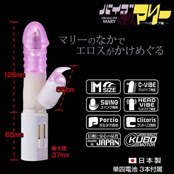 バイブ少女マリー、ヘッドバイブ編はワイドな面でクリちゃんを責めるスイングバイブです。大きな面でクリトリスを集中して刺激、しっかりとパワーを伝達します。またスイングは膣圧に負けないパワフル仕様、内側から女性を掻き乱します。本体先端には強力なヘッドバイブを搭載、これによりジンジンと響く様な刺激を実現しました。●無段階強弱調整