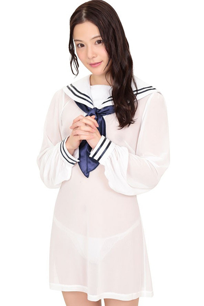 水で濡れたように透け感のある極薄仕様のセーラーワンピ(白)。白で清純そうに見せながらも、ストレッチの利いたネットメッシュ生地でセクシーに演出!夏や暑い日に最適なセーラーコスプレです。袖口、襟には2本のライン入り