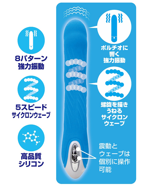 螺旋状に旋回しながらうねる、ポルチオ開発に特化したUSB充電式バイブ。個別操作可能な8種類の振動パターン&5段階のスピードウェーブを搭載!先端に内蔵された強力モーターの強烈な振動がGスポをグリグリと刺激する♪素材は医療用の高品質シリコンを採用、生活防水仕様。爽やかでシンプルな見た目ながらも充実機能満載のストレートバイブです。