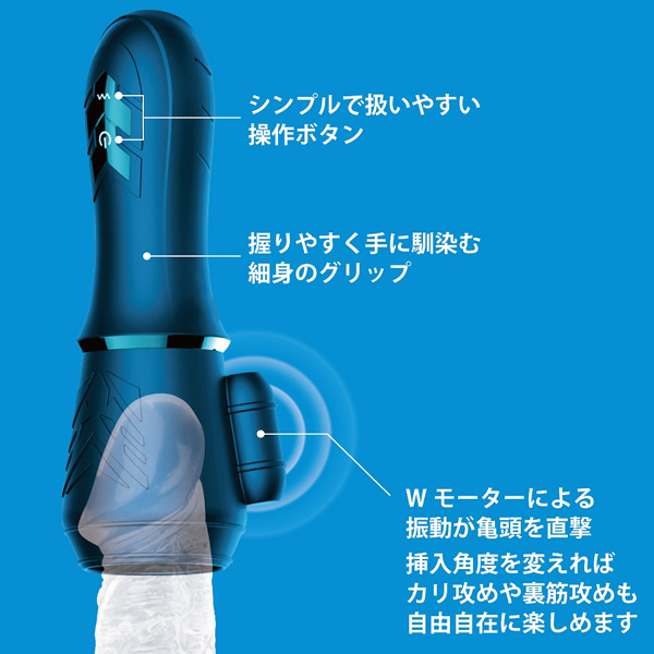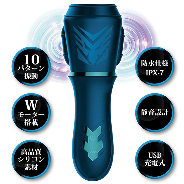 亀頭を鍛えて早イキ防止!Wモーターの強力振動が先端を激しく襲う電動オナホ。10種類の豊富な振動を搭載し柔らかなシリコンを使用!中は螺旋状に施された縦ヒダに、尿道口をサワサワと撫でる突起を無数に配置。使い込むほど亀頭を成長させ早イキ防止にも繋がる!また、SFチックな機械的で格好いいデザインも魅力の1つです。お手入れ簡単なIPX-7防水仕様