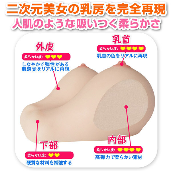 重量2600gの特大サイズ!お椀型の超爆乳Gカップを見て触って挟んで楽しめるおっぱいグッズ(ローション付)。どれだけ引っ張っても変形せず、気になるベトベト感を極限まで軽減した特殊な高弾力素材が人肌を完全再現!ふんわり柔らかな乳房と、非染色ながらほんのりピンクに染まったコリコリとした乳首の感触をしっかり堪能していただけます♪