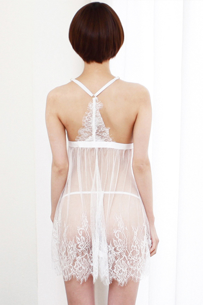 シアー素材でエレガントに仕上げた純白ベビードール&Tバック。繊細なレースとリボンで素肌を彩り可憐に演出!