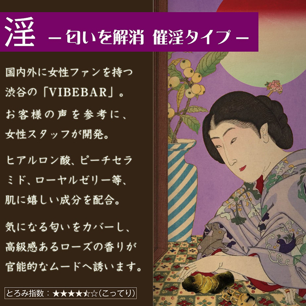 渋谷バイブバーの女性スタッフが女性の「匂い」に関する悩みをもとに開発!高級感のあるバラの香りで官能的な気分を高める高品質な催淫ローション170ml。適量塗布するだけで秘密のニオイをカバー♪また、シリコン&ポリアクリル酸Naフリーで肌の負担を軽減!ビタミン、ピーチセラミド、ローヤルゼリーなど美容のための保湿成分をたっぷり贅沢に配合した女性に嬉しい仕様。日本製