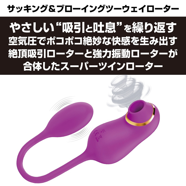 吸引×振動で中外を同時に刺激できるUSB充電式のスーパーツインローター。生活防水加工を施した柔らかく滑らかな高品質シリコンボディ仕様♪4種類の空気圧でポコポコと吸引刺激しつつ、12種類のパターンで強力振動!個別使用はもちろんダブルで使えば快感も倍増♪一つで2度おいしい高性能ローターです◎本体全長41.5cm