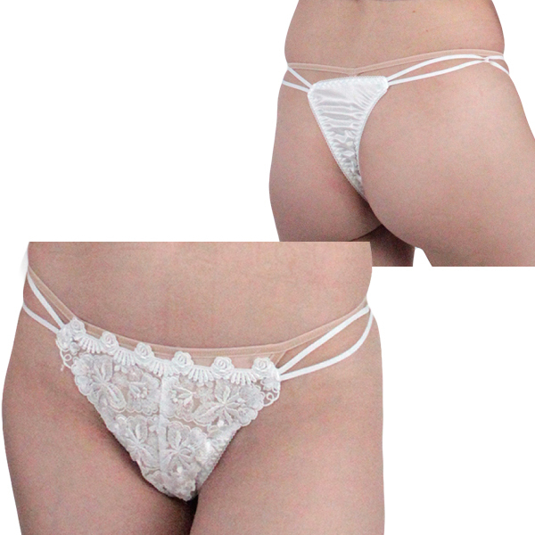 サテン風の光沢生地を上品な花柄レースで装飾したフェミニンな日本製Tバック。ダブルサイドストリング仕様のお洒落なデザイン♪肌に心地よくフィットし、ヒップラインを美しく演出します。可憐なホワイトカラー◎Mサイズ