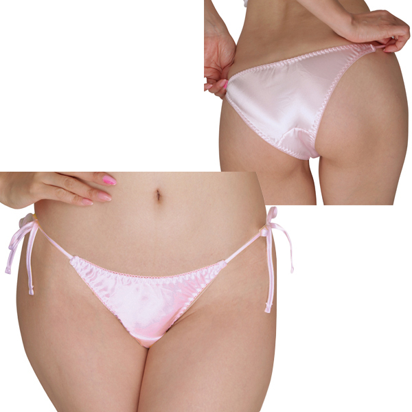 光沢感が美しいサテン生地の女性用フルバックショーツ。両サイドはセクシーな結びヒモ仕様で、結び目をパートナーに解かせる楽しみも!◎ピンク、2Lサイズ