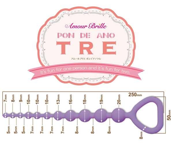 有名ドーナツのようなフォルムと優れた柔軟性が特徴の、取っ手付きアナルビーズ「ポンデアノ」に新色ブルーベリーが登場。肌に優しいピュアシリコンを100%使用!一番小さなサイズで7mm、最大幅20mmまでの9連ビーズ仕様で、初めての方から上級者の方まで幅広くお使いいただけます。
