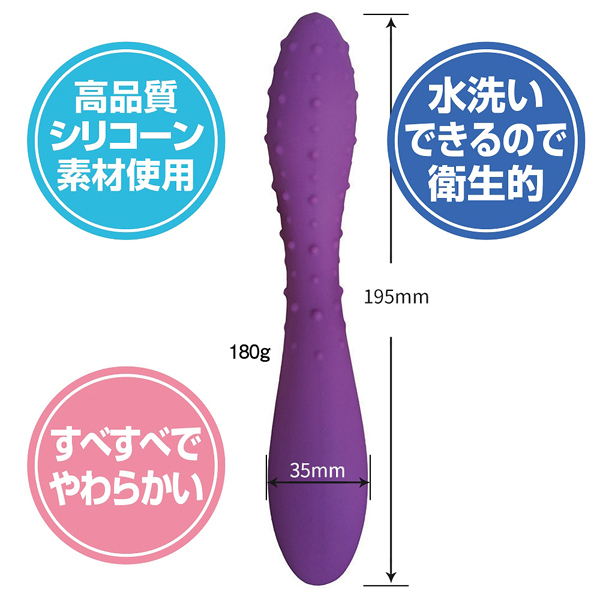 刺激的なイボ突起と滑らかな挿入感のノーマル、2種類が楽しめる双頭ディルド。全長19.5cm、最大幅は3.5cmと適度なサイズ感で、素材は温かみがあり柔らかい高品質なシリコン仕様で肌に優しい設計!Gスポ&前立腺を狙い撃つブーメラン型。水洗いできるので衛生的です♪