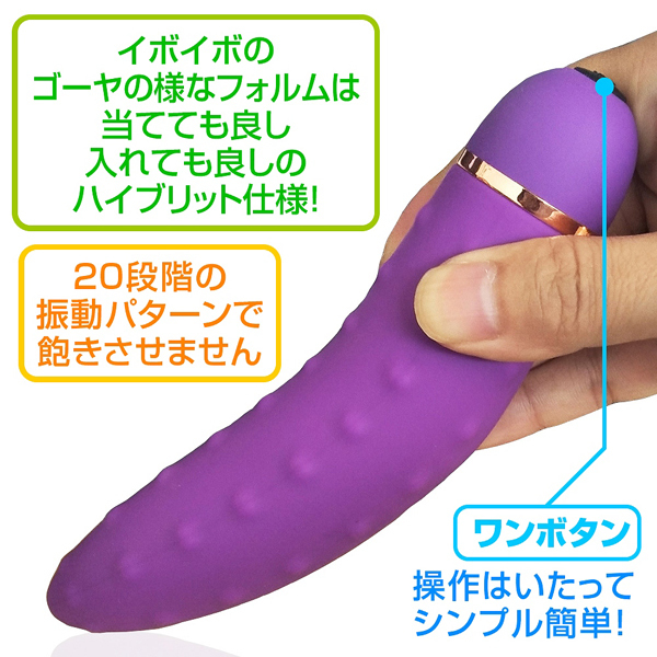20種類の豊富なアクションを搭載!粒々突起を無数に配置したゴーヤ形状の電池式バイブ。多彩な振動を味わえるのに操作はワンボタン式でビギナーも簡単に使える!全長16cm、最大幅3.8cmとハンドサイズで、携帯用としても重宝します。また、当てる他に挿入刺激もOK!丸洗いできる生活防水仕様で実用性もバッチリです♪滑らかで柔らかい高品質シリコン製◎単3電池を1本使用