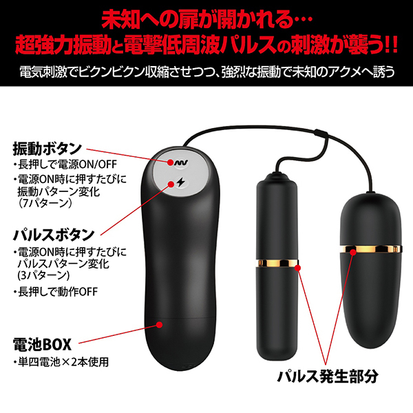 未知への扉が開かれる…超強力振動と電撃低周波パルスの刺激が襲う!!電気刺激でビクンビクン収縮させつつ強烈な振動で未知のアクメへ誘う。痺れる快感を体感するパルス×振動のダブルローター!●7パターン振動●3パターンパルス●さらっとしたマットな質感# 単四電池×2本(別売)※2つのローターのメタル部分両方に触れている際にパルス刺激が発生します。【※パワーを強くしても刺激が弱い、または感じない場合】肌が乾燥していると感じにくいことがあります。蒸しタオルなどで肌を湿らせてからご使用ください。