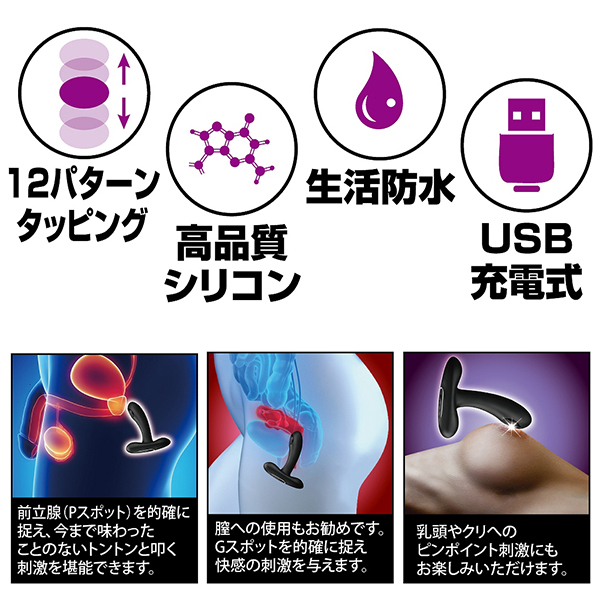 Gスポットをコツコツとノッキングするかのような独特の刺激が楽しめる「プリティラブ (P&Gスポットタッピングバイブレーター)」。よくあるバイブ特有の振動とは異なり、まるでマッサージ機のような震え方が新感覚のバイブレーターです♪バイブとしては丁度よいサイズ感で挿入シャフト部分のタッピング機能はタッピングボタンを押す度に3パターンから切替可能!振動ボタンは押す度に12パターンの切り替えが出来、電源のオンオフも起動時にワンプッシュでOFFと簡単操作♪付属のアタッチメントを装着することで敏感な箇所をさらにピンポイントで刺激できます。クリバイブは12パターンを搭載!挿入シャフトとの組み合わせ次第で豊富なバリエーションの刺激をお楽しみ頂けます。