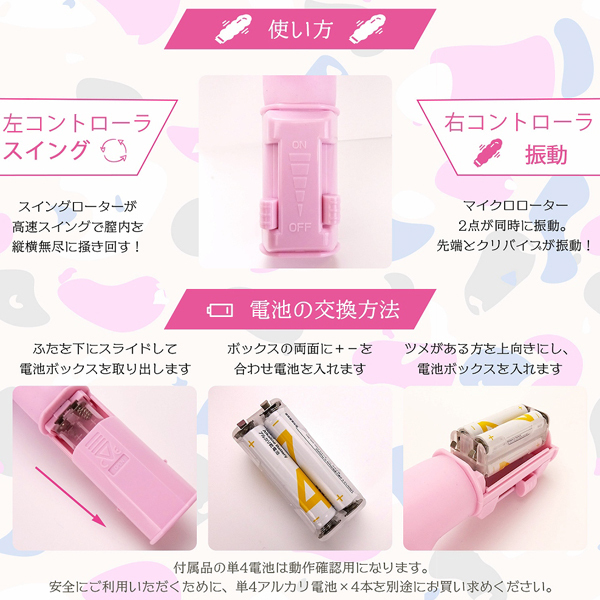 【単四電池×4本(付属)】Gスポット&クリイキのダブル昇天レッスン!強力モーターの6Vパワーで、秒ヌレ即イキ!丸みを帯びた大きめヘッドが膣内を満たして、Gスポットを密着刺激。シャープな先端は、膣の奥をピンポイントに震わせます。丸みを帯びた大きめヘッドが膣内を満たして、Gスポットを密着刺激。挿入しやすそうなシャフトの形状に、L字に近い角度でクリをしっかり捉える子バイブをシームレスにデザインしたスイングとバイブの2つの機能でイカせてくれるバイブ!