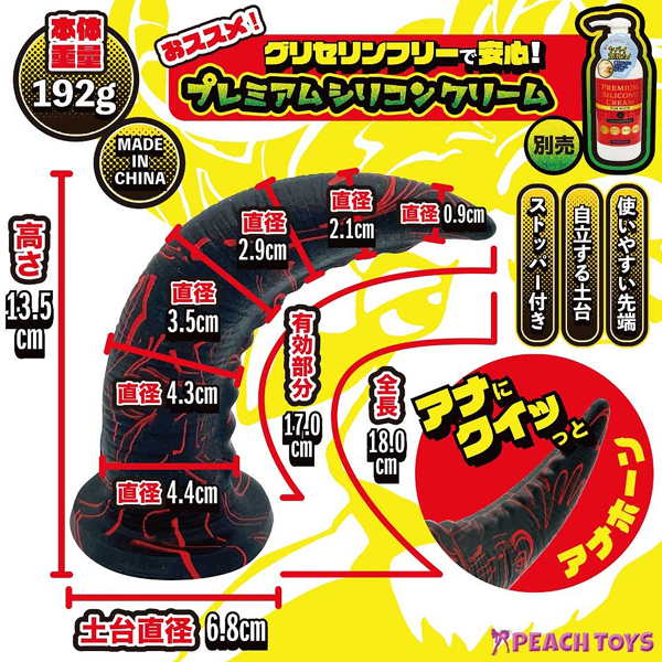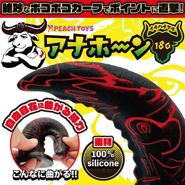 「穴にクイッと!このカタチ」「アナホーン180(イチハチマル)」角のようなカーブ形状のディルドの登場です!使いやすい先端と、絶妙なボコボコカーブでポイントに直撃!100%シリコン素材でべたつかず、自由自在に曲がる弾力!自立する土台!(※吸盤付ではありません。)柔らかい弾力で、穴に優しくフィットします。国内メーカーのアナルディルドとしては異型なモデルと言える角形のアナルディルドで魅力的なフォルム!最大直径44cm、有効部分は17、0cm。