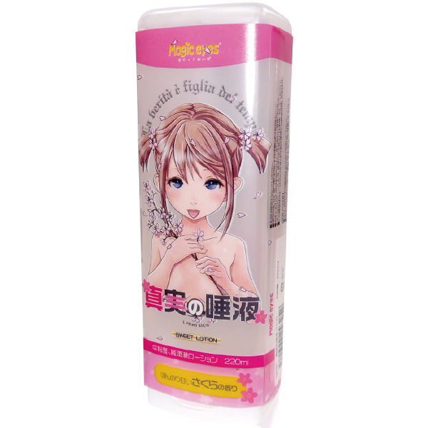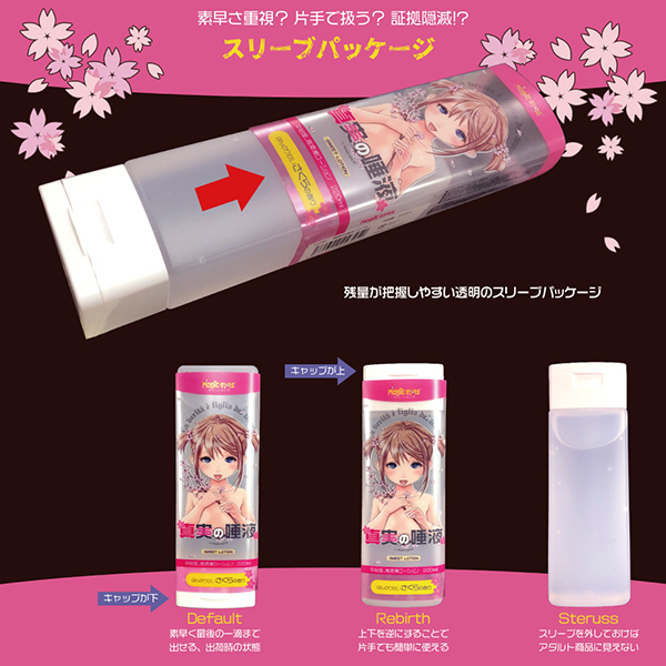 ほどよくとろける感じでフェラホールとの相性がバツグンのローション「真実の唾液さくら」。真実の口シリーズのために開発されたフェラホ用のローションで高潤滑な中粘度タイプとなっています♪バランスの良いテクスチャのため、手コキとかにも良さ気です。ほんのり甘いサクラの香りがついているので甘いときめきを嗅覚でも感じられます♪かわいいスリーブケースを剥がせば無地のボトルになるのでパッケージが気になる人にも安心です。