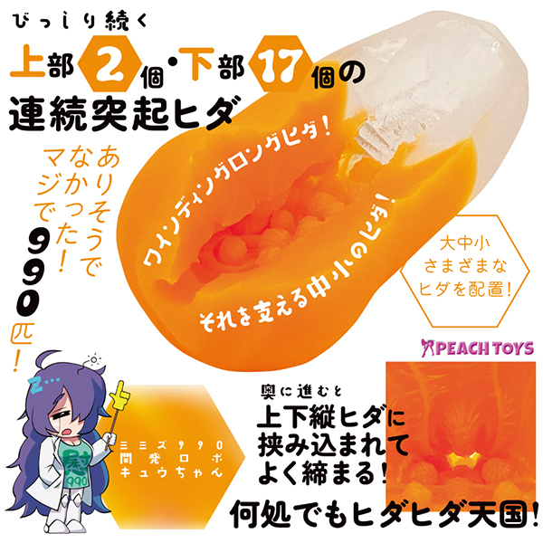 名器に革命!総数990本もの多彩なヒダをぜいたくに配置した非貫通オナホ「KAKU−MEIKI MIMIZU990(カクメイキ ミミズキュウヒャクキュジュウ)」の登場です。ミミズ千匹とは「ヒダが多く存在している名器の例え」ですが、実際に多くのヒダヒダを配置したらどんな感触なのか?ということをコンセプトに真面目に「ミミズ990匹」で作り上げました!フォルムはシンプルな筒型で、挿入口もいたってシンプル。ですが内部構造は只者ではなく、連続する突起ヒダにワインディングロングヒダが迫力満点に襲いかかり、際どい刺激と程よいゾリ感をもたらしながら搾精力を高めてくれます!バランスと長さが異なる990のヒダの数々。持ち手を変えたり、挿入位置やストロークの変化で究極のヒダ刺激を存分にお楽しみください♪