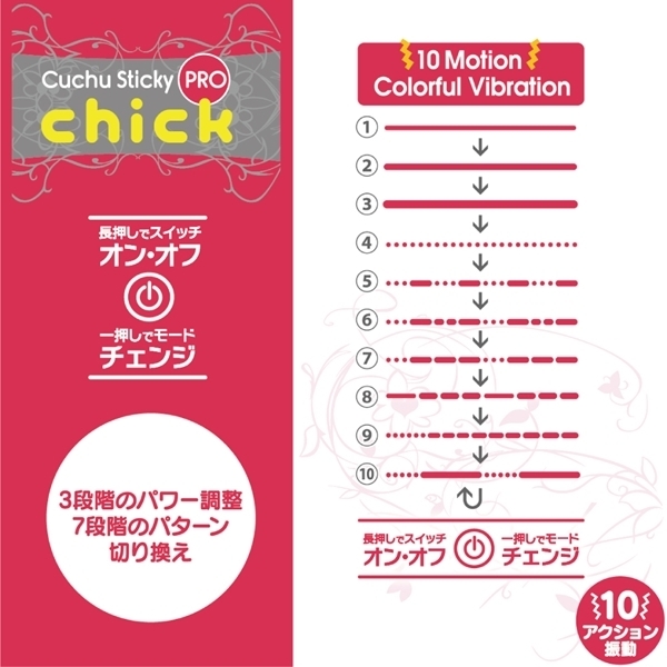 USB充電式なので電池交換の煩わしさもなく、Gスポット等の敏感な場所にもピンポイントで届く絶妙なサイズ感が嬉しいクチュスティッキーChickです。10モードもの振動パターンの中から自分の好みを選ぶことが出来、生活防水設計を搭載しているのでメンテナンスもカンタン♪マグネット式の充電用USBケーブルが付属しているのでご家庭の環境で届いたらすぐに充電が可能です。操作方法も簡単で電源スイッチの長押しでオン・オフができます!クリムゾンマットコーティングのボディは長さ171mmと十分なサイズ、太さ21mmは太すぎず、重さは50gと軽量なので、どなたでも気軽にお使いいただけます。