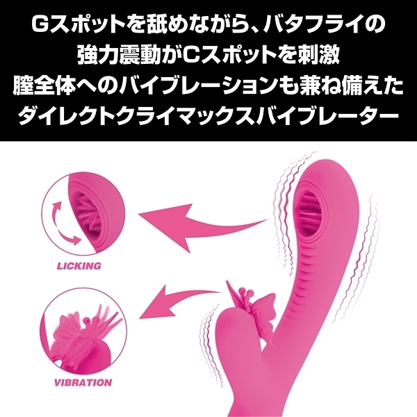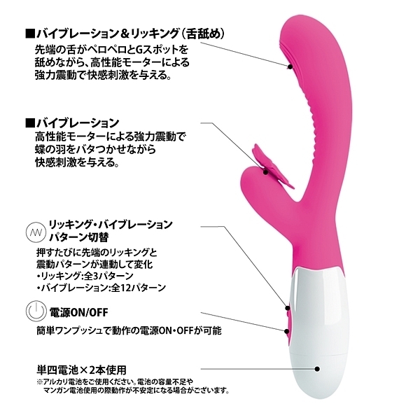 Gスポットを舌先でペロペロと高速愛撫するような快感と、子機に装着されたバタフライの強力震動による快感に絶頂必至間違いなし。高性能モーターの強力震動が外から内から響き渡り快感がほとばしる!膣、クリ共にフィットして最高の刺激を味わえる、ダイレクトクライマックスバイブレーター●12パターン振動●3パターンリッキング(舐め)●高性能モーター搭載●高品質シリコン素材●生活防水※アルカリ電池をご使用ください、電池の容量不足やマンガン電池使用の際動作が不安定になる場合がございます、挙動が不安定な場合は新品のアルカリ電池を使用し、動作確認を行ってください。