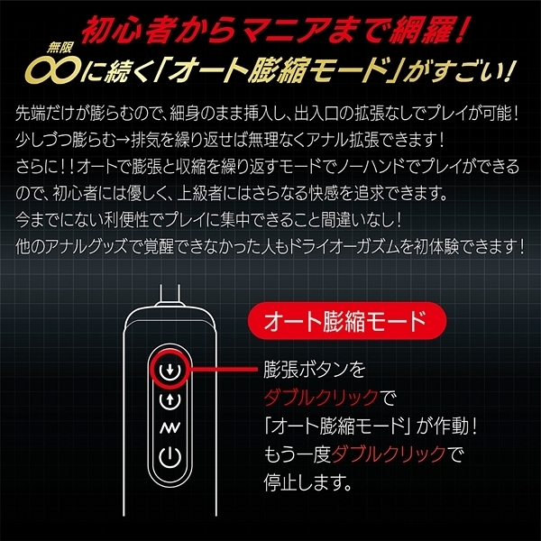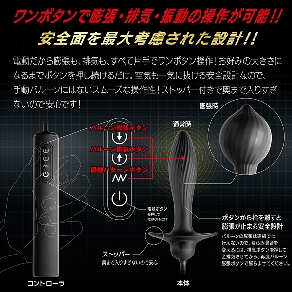 ワンボタンで膨らむ電動アナルバルーンが、前立腺をワイドに圧迫刺激!お好みサイズに膨らませて、眠れる前立腺を一気に覚醒!初心者にも最適細身の本体を挿入後、先端だけを膨らませるので出入口の拡張なしでボリューム感たっぷりの圧迫を楽しめます。電動式で静かに膨張、一気に収縮。ダブルクリックで発動するオート膨縮モードは、自動で膨張と収縮を繰り返します。ワンボタン操作だから、どんな姿勢でも使えるのが嬉しいですね。