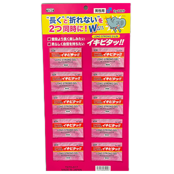 男の武器!”長く”と”折れない”を2つ同時に!ナイトライフをWでサポートしてくれる男性用ジェル「イキピタッ?」が新登場。イザという時の直前にサッとひと塗りすれば普段よりも楽しめるロングプレイとパートナーを満足させる男性力もWをサポート。1回分の使い切りタイプだから持ち運びにも便利!ジェルは無色透明で伸びが良いなめらかな使い心地になっておりほぼ無臭です。完全国内生産だから安心してお使い頂けます。2g×10個綴り
