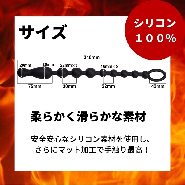 100%ピュアシリコンで作成した安心安全な10個のビーズが連なった取っ手付きのアナルビーズです。先端部は直径2cmと2.6cmの一体ビーズ型。続いて直径2.2cmの玉が3連続して、直径1.6cmのビーズが5連続きます。差した状態で、ローターをあてたり、そのまま散歩したりと想像以上にいろいろシチュエーションでの使用が可能です。