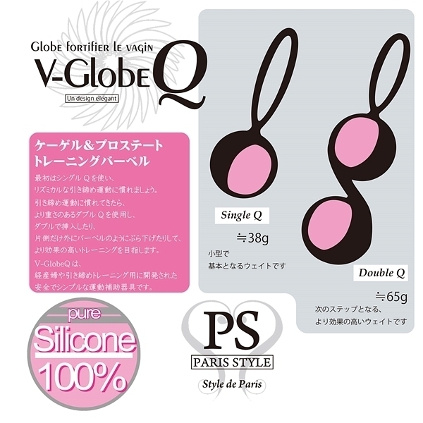 内部の筋力を高めて快感の頂点へと導くトレーニンググッズです♪動くとボールの振動が内部に響いて、心地良い刺激が全身を駆け抜ける!医療用シリコンを採用しているので安心してプレイがお楽しみいただけます♪最初はシングルQを使い、リズミカルな引き締め運動に慣れたらより重さのあるダブルQを使用!ダブルで挿入したり片側だけ外にバーベルのようにぶら下げたりして、より効果の高いトレーニングを実践していただけます。V−GlobeQは、経産婦や引き締めトレーニング用に開発された安全でシンプルな運動補助器具です。
