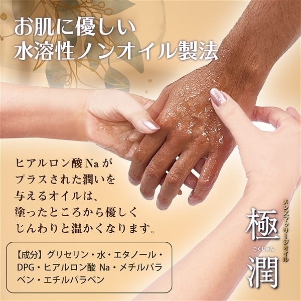 「最上級の潤い」、「最上級の滑らかさ」、さらに「最上級の使いやすさ」を追い求めて完成したマッサーオイル「極潤」。保湿に優れたグリセリンに加えヒアルロン酸Naを贅沢に配合することで使用後はもっちりぷにぷにしたお肌に仕上がります。熱伝導に優れた温感タイプなので塗った瞬間からじんわり温かく感じます。※成分上、舐めると甘く感じますが飲み物ではございません、飲み込まないようにご注意ください。大変滑りやすいので足元にこぼさぬようご注意ください。詰替え用タイプ