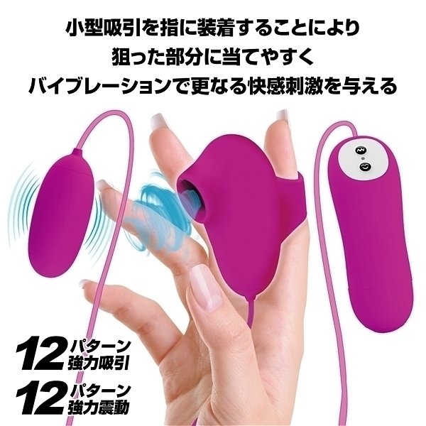 指装着型の小型吸引ローターが的確にCスポットを快感刺激。同時にもう一つのローターがピンポイントに中も外も刺激する多機能型一体ローター●12パターン強力吸引●12パターン強力震動●高品質シリコン素材●生活防水