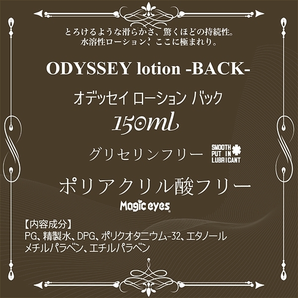 ポリアクリル酸フリーの水溶性ローションでありながらオイルローションのような滑らかな使用感。糸を引くようなタイプのローションでは無いので馴染ませながら少しずつ量を増やしていって下さい。BACKはグリセリンを使用して無いのでエネマグッズ使用時やバックプレイ時の潤滑剤としても使用出来ます。ボトルにはワンタッチキャップを採用しておりますので取り回しも簡単です。150mlの使い切りタイプ。日本製