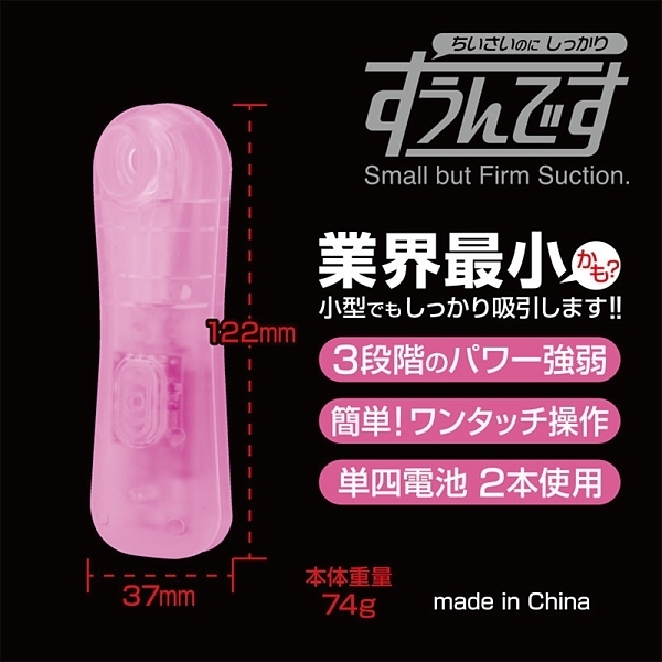 現在、流行中の吸引系ローター。その中でも最小・最軽量・最安を目指して作られたのが、この「すうんです」です。単四電池2本を入れ、電源スイッチ長押しでスタート。あとは電源スイッチを短押しすることで、3段階のパワー強弱をお楽しみいただけます。本製品は小型で簡易的なモデルですが、十分な吸引力を発揮。手軽に、コンパクトに、吸引ロータを楽しむことが可能です。最小・最軽量・最安にこだわった吸引ローター「すうんです」。小型だからと侮らずに、お試しください。●カラー:スケルトンピンク