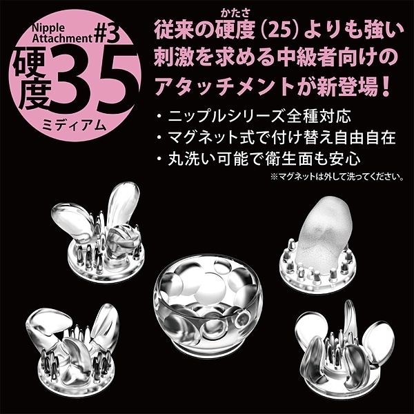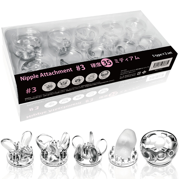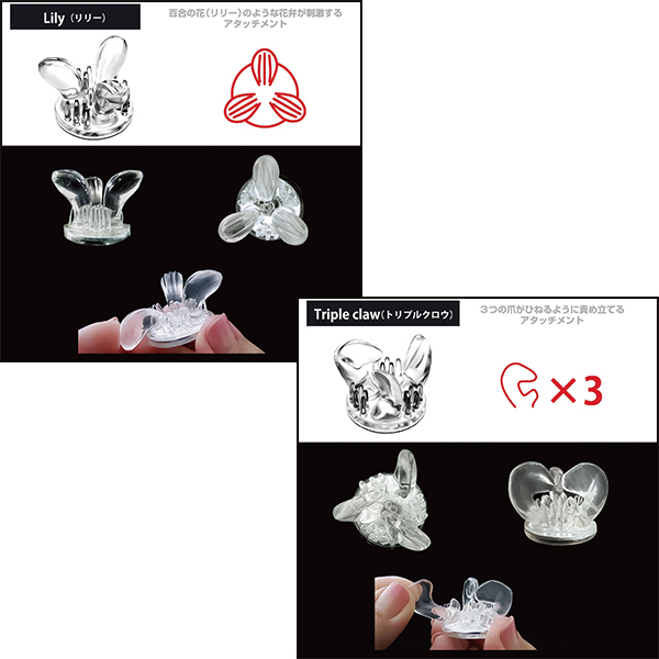 個性あふれる5種のアタッチメントを、両乳首に使えるよう、すべて2個ずつご用意。セットで使うもよし、あえて別々にして2人から乳首責めを疑似体験するのも一興です。●Lily(リリー)リリーの花をイメージした、外側にひらく花びら型のアタッチメント。●Triple Claw(トリプルクロー)内側に向かった3つのツメが特徴的なアタッチメント。●Propeller(プロペラ)5枚のプロペラが次々と乳首を刺激するアタッチメント。●Single Tongue(シングルタン) 小さな舌が回転しながら舐め尽くすアタッチメント。●Ball Cup(ボールカップ)カップの中に大小さまざまのボールが不規則配置されたアタッチメント。●素材:エラストマー※直にお肌と接触する場合は、必ずローション(水溶性)をご利用ください。※こちらの商品はニップルドーム・カップシリーズの交換用アタッチメントです、商品単体ではご使用いただけませんのでご注意ください。
