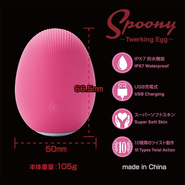 このスプーニー トワーキングエッグはとても柔らかな肌触り。まるでマシュマロの様な滑らかさが自慢です。また振動は珍しい左右ツイスト振動。優しく、心地よいツイスト振動があなたを揺らします。操作は簡単。まず電源スイッチを長押しで起動。起動後は短押しで10種類の振動パターンを楽しむことが可能です。およそ55分の充電で最大25分の使用が可能です。女性への優しさが詰まったスプーニー トワーキングエッグ。ゆらゆらと揺れる様な振動をお楽しみください。●カラー:ピンク