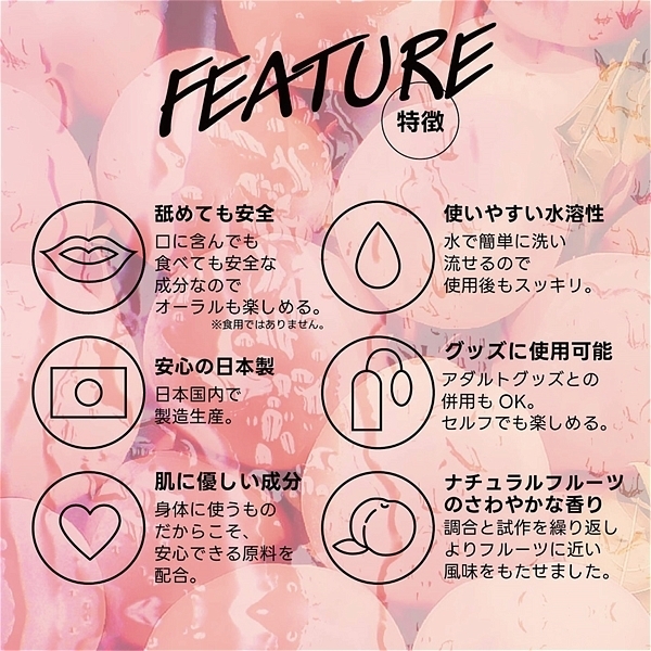 ピーチ。フルーティーな味と香りで新感覚プレイ!ワイルドワン女子が企画・開発した女性のためのフレバーローション!安心安全の国内素材で水のように「超さらさら」、フルーツみたいに美味しい水溶性ローションです!<成分>精製水、PG、ポリクオタニウム-39、グリセリン、サッカリンNa、ヒアルロン酸Na、ハチミツ、アロエベラ葉エキス、香料、赤色106号、BG、エタノール、メチルパラベン、エチルパラベン、プロピルパラベン、プチルカルバミン酸ヨウ化プロビニル。※「本製品はバイブバー公式認定ローション 味・香り付き」の後継として開発されましたが味と香り付きという点以外は、成分もテクスチャもまったく異なる新製品です。