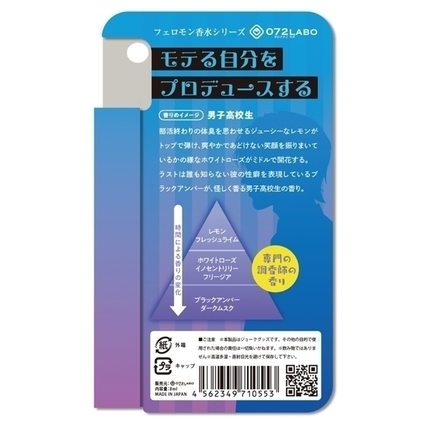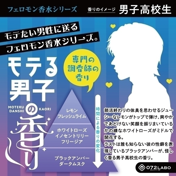 専門の調香師にフェロモンを感じる香りとはなにかを分析してもらい相手を魅了する香りに仕上げました。気になるあの人へ魅惑的で官能的なアピールでオトナな夜をお楽しみください。●男子高校生:部活終わりの体臭を思わせるジューシーなレモンがトップで弾け、爽やかであどけない笑顔を振りまいているかの様なホワイトローズがミドルで開花する。