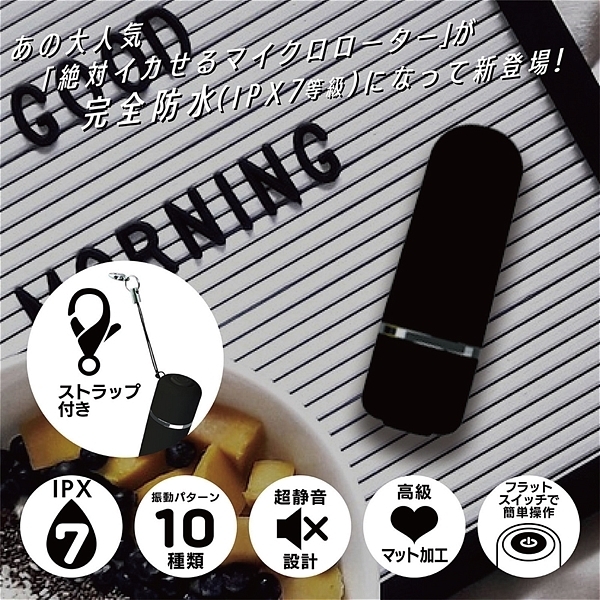 あの絶対イカせる極小ローターが完全防水(IPX7)に大変身!完全防水(IPX7)になって新登場。どれだけ濡らしても安心で、お楽しみ後は丸洗いOK。振動パターンは、なんと10種類!大人の親指くらいしかない超マイクロサイズなのに、とってもハイパワー。しかも超静音設計●素材:ABS●防水レベル:完全防水(IPX7)●カラー:クロ