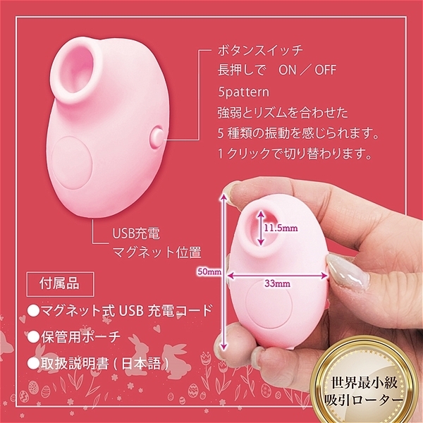 陰核体(クリトリス)への吸引機能がついたセルフプレジャーアイテム。アンケートで女性に好評だったパステルカラー3色が揃ってデビュー!「エアーバルブ方式」を採用し、近年発売されるトイの中でも注目度の高い吸引系グッズを、世界最小レベルの超小型化に成功。握ると手の中に隠れてしまうほどの極小サイズです。段階を経て優しく吸引することにより、心地の良いオーガズムを体感することができます。●カラー:ピンク