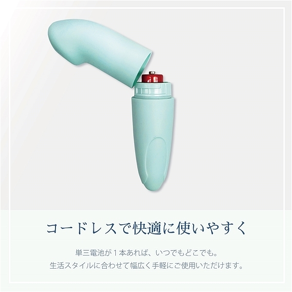 単三電池一本で簡単に使える、セルフケアグッズです。清潔感のある優しいシンプルなデザイン。おやすみの前に、宿泊先に、生活スタイルに合わせて幅広く手軽にご使用いただけます。しっとりとした滑らかなマット感のあるシリコンコーティングが、手軽さの中にも上品さを演出します。生活防水仕様だから汚れたらサッと洗えばOK、お手入れのしやすいアイテムです。●カラー:グリーン