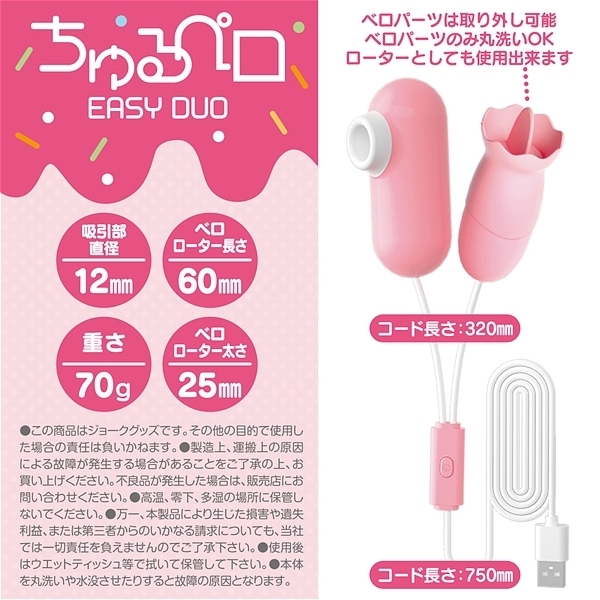 仕様:パッケージ:13.0×10.0×4.0cm 本体:吸引ローター(6.8×2.8cm)、ベロローター(6.0×2.5cm)、コード全長110cm USB充電式
