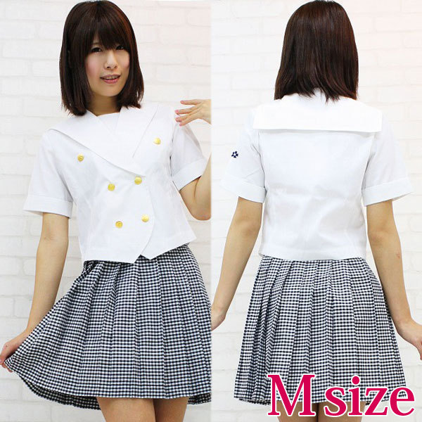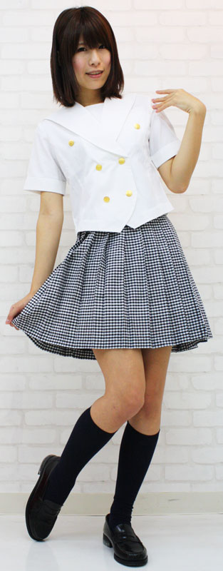 仕様:Mサイズ:B78〜88cm・W58〜73cm 丈:上着47cm(袖丈22cm、肩幅36cm)・スカート46.5cm セット内容:上着(ピケ生地使用、前ボタン留め、金ボタン、左袖に校章付き)・スカート(横ファスナー、アジャスター有り、黒ギンガムチェック生地)